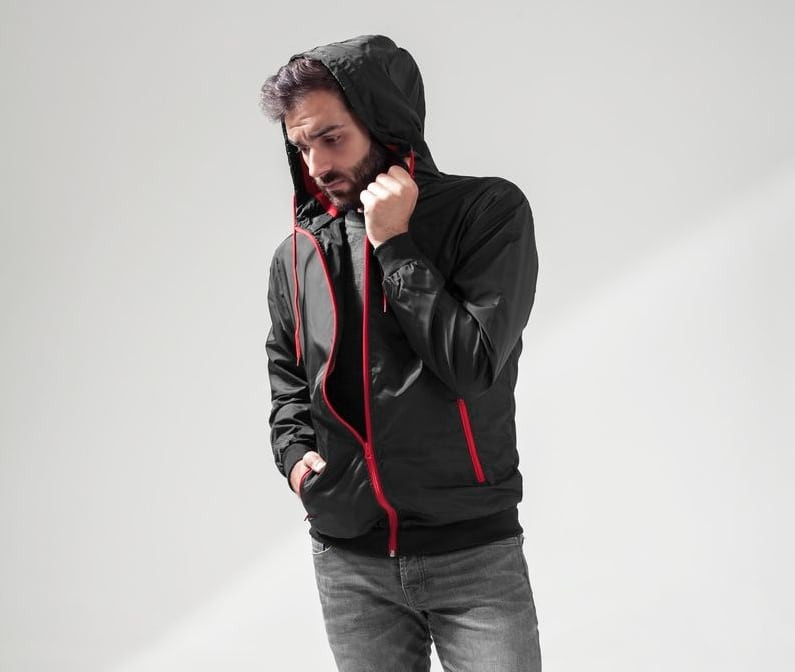 Jakke med stor lynlås. Hætte med kontrastfarvede snore. Vindjakke, åndbar og vandtæt. Netforing. Kontrastfarvet lynlåslukning. Sidelommer med kontrastfarvet lynlås. Uden mærketikette, kun størrelseslabel.